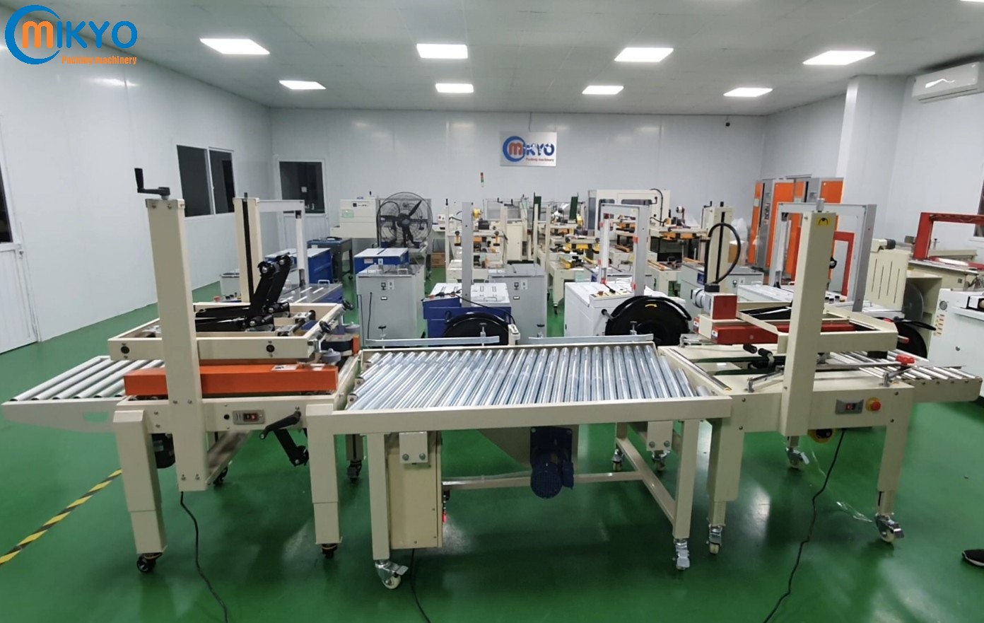 - The barrel is then moved through a rotating conveyor. Here, the conveyor is specially designed to help the barrel rotate 90 degrees along with the guide mechanisms to help the box move to the correct position of the carton sealing machine with 2 parallel tapes on both the top and bottom.