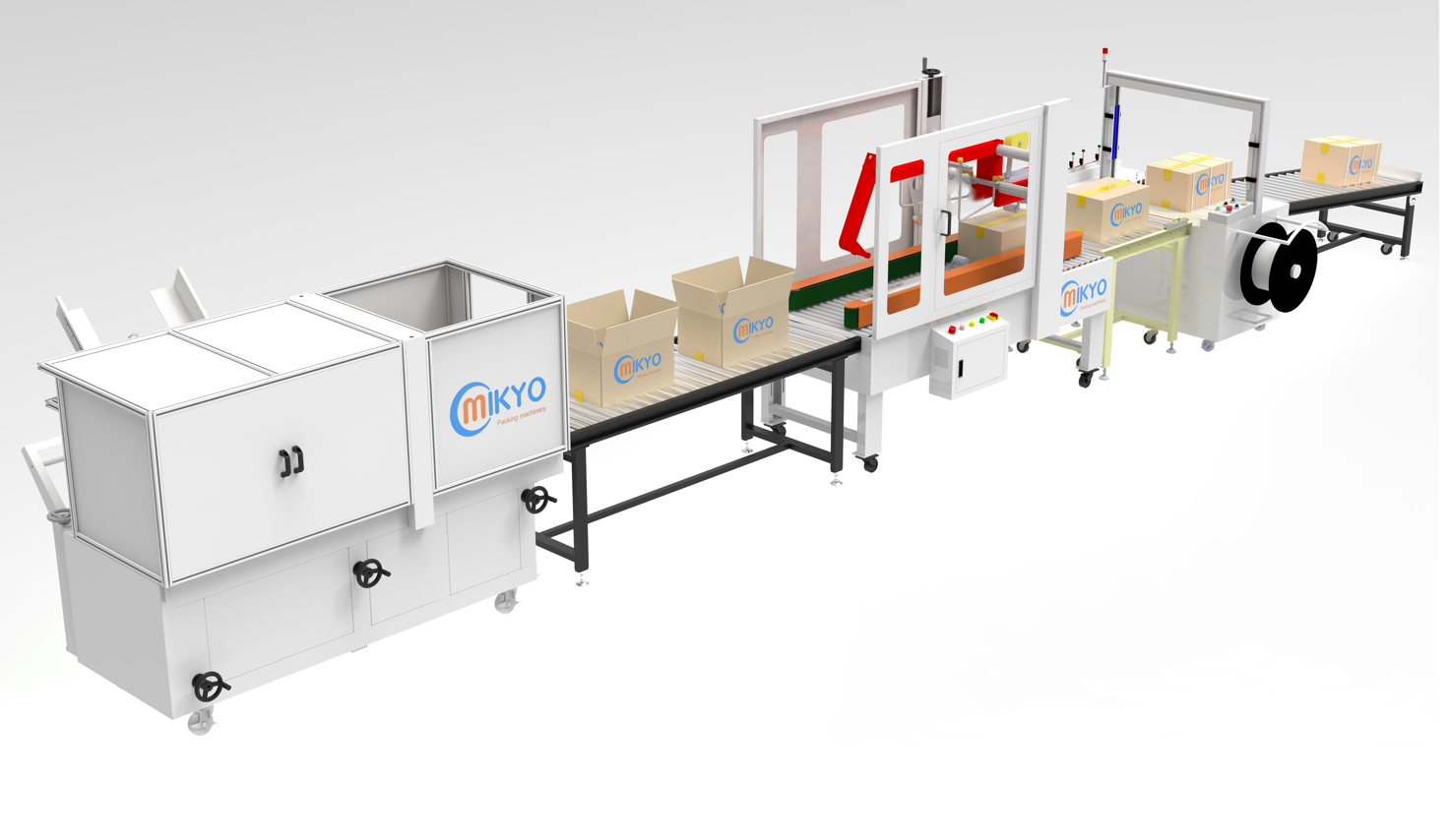 Dây chuyền đóng gói thùng carton tự động các công đoạn cấp mở thùng, dán và đóng đai. Đây là hệ thống khá phổ biến trong các doanh nghiệp sản xuất kinh doanh, khi nhu cầu đóng gói hàng hóa để di chuyển và lưu kho là không thể thiếu.